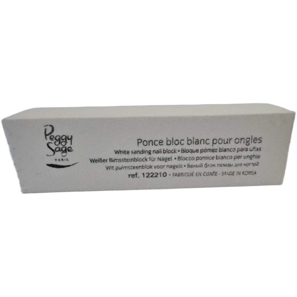 Valkoinen suorakulmainen Peggy Sage -hiomapalkki kynsien tasoittamiseen, jonka sivussa on mustaa tuotetekstiä.