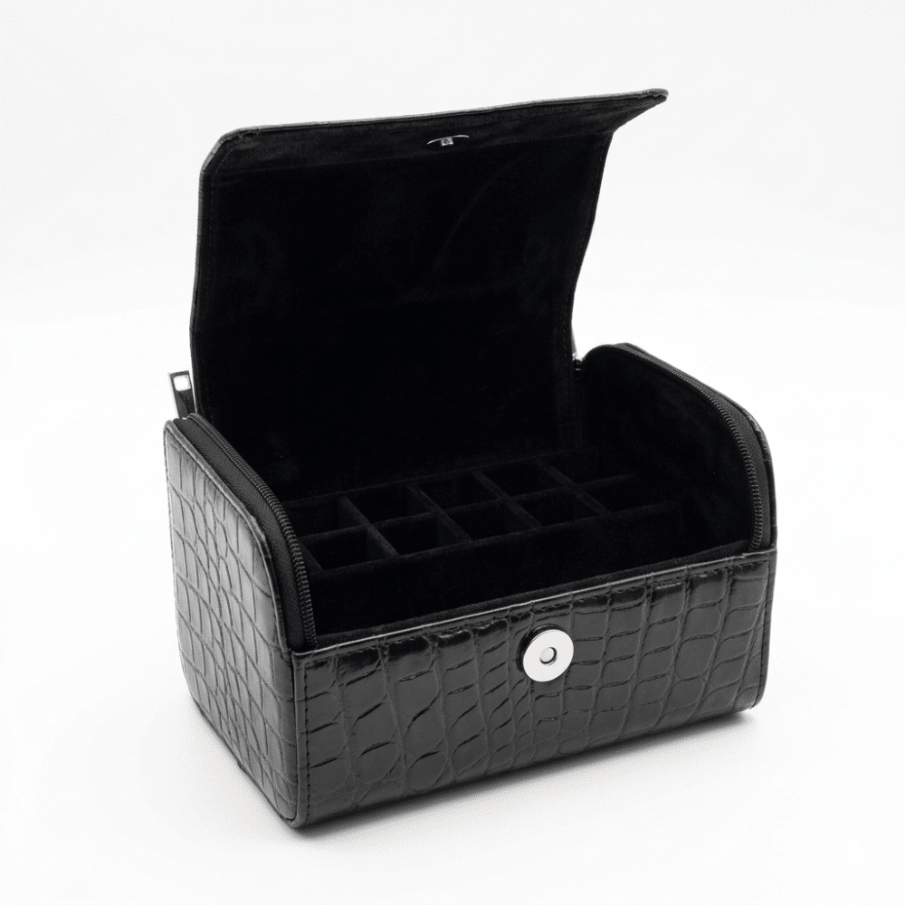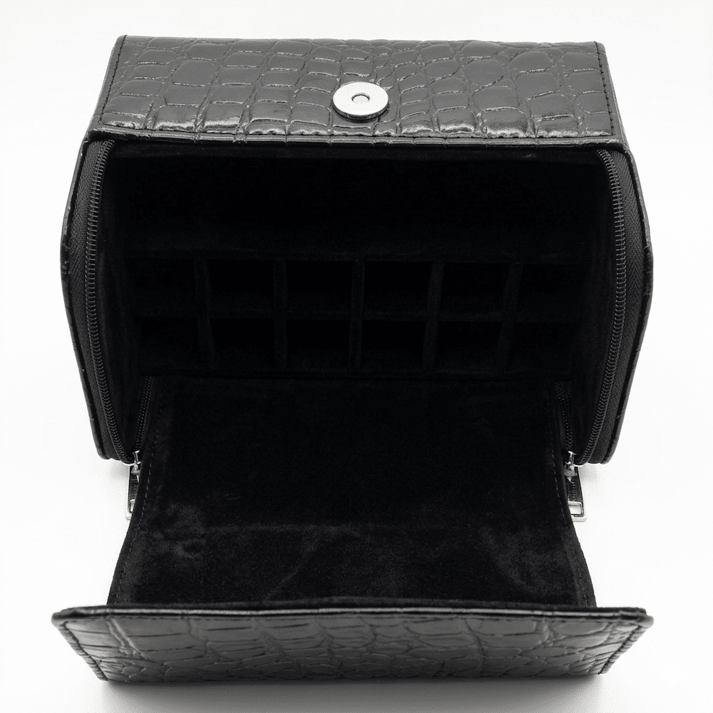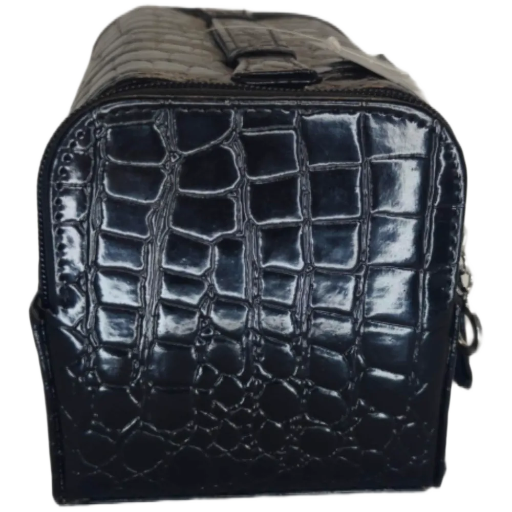 Tämä upea krokotiilikuvioitu Peggy Sage kynsilakkalaukku tarjoaa elegantin ja käytännöllisen ratkaisun kosmetiikan organisointiin. Se pitää suosikkilakkasi tukevasti paikoillaan ja kauniisti esillä. Laukun selkeä rakenne nopeuttaa oikean sävyn valintaa ja suojaa pulloja, tehden kynsien huoltamisesta vaivatonta ja ammattitasoista – olitpa sitten kotona tai matkalla.